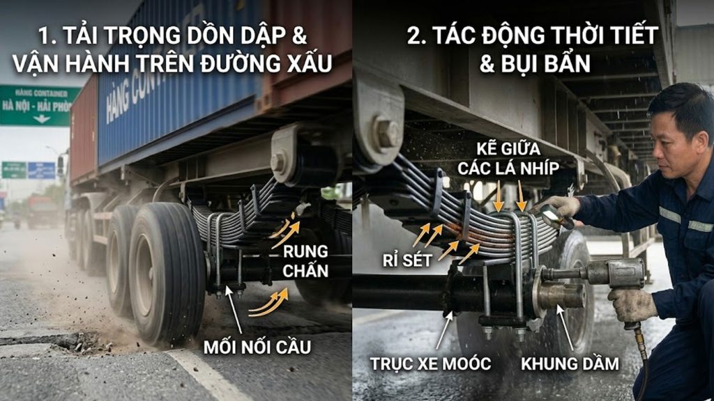Tác động của thời tiết và bụi bẩn Miền Bắc có mùa mưa phùn ẩm ướt kéo dài. Nước mưa mang theo bụi bẩn lọt vào kẽ giữa các lá nhíp, gây ra hiện tượng rỉ sét và ăn mòn hóa học. Lớp rỉ sét này làm tăng ma sát khô giữa các lá nhíp, khiến bộ treo trở nên cứng nhắc, không còn khả năng giảm chấn tốt, từ đó truyền rung động trực tiếp lên khung dầm và lốp xe.