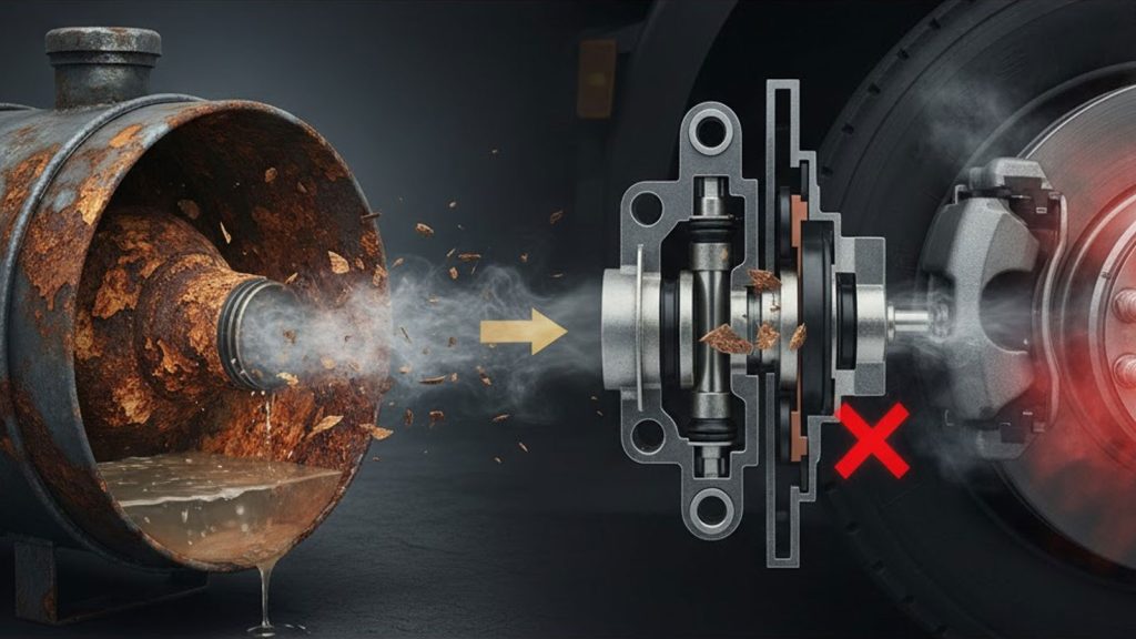 - Tàn phá van phanh: Khi tài xế đạp phanh, dòng khí mang theo vảy rỉ và bụi kim loại sẽ đi vào các van chia hơi, van tổng phanh và bầu phanh. Các hạt rỉ sét sắc nhọn này làm trầy xước gioăng cao su, gây kẹt van, dẫn đến hiện tượng bó phanh hoặc mất phanh cực kỳ nguy hiểm.