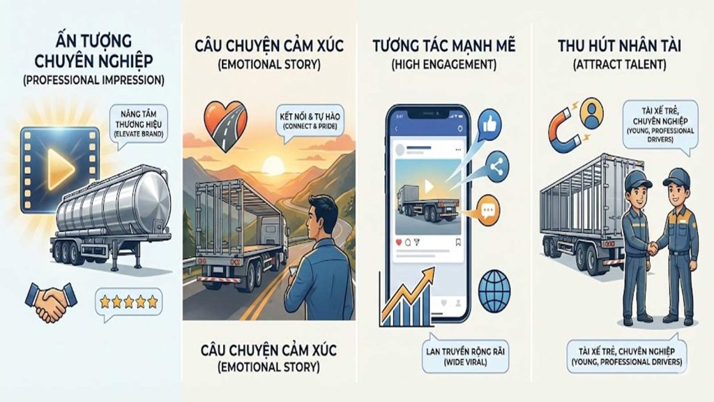 - Truyền tải cảm xúc và câu chuyện: Một chiếc moóc không chỉ là thép và bánh xe. Video có thể truyền tải câu chuyện về những hành trình vượt khó, sự kết nối các vùng miền, và niềm tự hào của người tài xế.