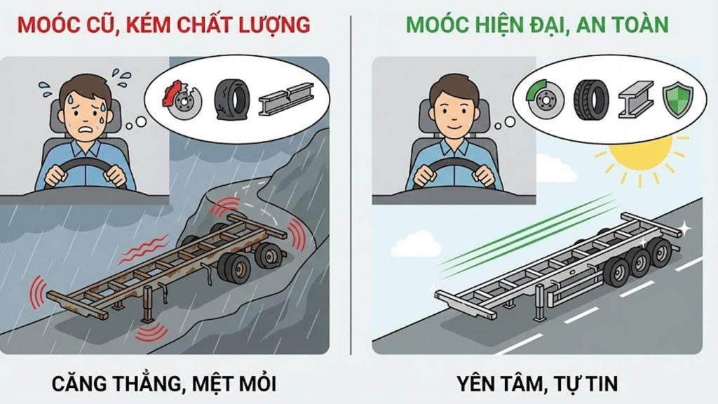 - Với moóc cũ, kém chất lượng: Tài xế luôn trong trạng thái căng thẳng vì sợ phanh không ăn, nổ lốp do lệch trục hoặc nứt dầm khi chở nặng. Tâm lý lo âu này dẫn đến mệt mỏi nhanh chóng và giảm khả năng xử lý tình huống.