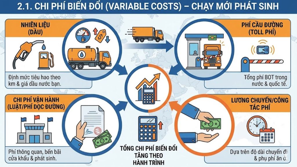 - Chi phí vận hành (Luật/Phí dọc đường): Các khoản phí thông quan, phí bến bãi cửa khẩu, và các chi phí phát sinh thực tế trên lộ trình quốc tế.