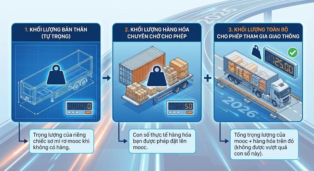 - Khối lượng toàn bộ cho phép tham gia giao thông: Tổng trọng lượng của mooc + hàng hóa trên đó (không được vượt quá con số này).