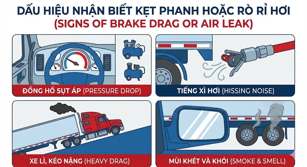 1. Dấu hiệu nhận biết rơ mooc đang bị kẹt phanh hoặc rò rỉ hơi