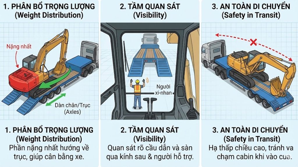 Việc đưa một chiếc máy xúc nặng hàng chục tấn lên sàn sơ mi rơ moóc lùn là công đoạn nguy hiểm nhất trong quá trình vận chuyển. Đa số các bác tài kinh nghiệm đều chọn kỹ thuật lùi máy lên sàn để đảm bảo trọng tâm và tầm quan sát.