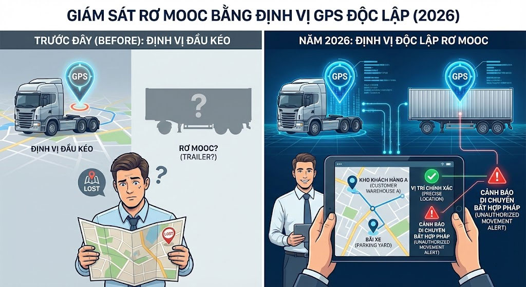 Trước đây, chủ xe thường chỉ định vị đầu kéo. Tuy nhiên, năm 2026, việc lắp định vị cho riêng rơ mooc đã trở thành tiêu chuẩn.