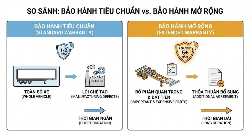 Bảo hành tiêu chuẩn thường đi kèm với sản phẩm và tập trung vào các lỗi chế tạo của nhà sản xuất. Trong khi đó, bảo hành mở rộng là một thỏa thuận dịch vụ bổ sung, kéo dài thời gian bảo vệ cho các bộ phận quan trọng lên đến 5 năm hoặc thậm chí lâu hơn.