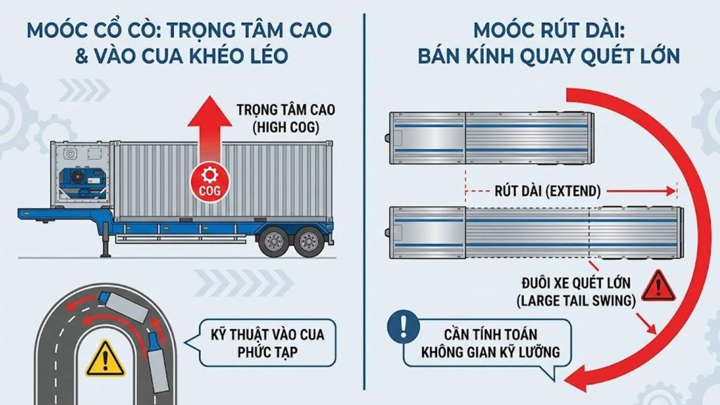 - Kỹ thuật vào cua: Tài xế cần mở cua rộng hơn so với moóc thường. Tuyệt đối không đánh lái gấp ở tốc độ trên 20km/h khi xe đang có hàng, vì thiết kế cổ cò rất nhạy cảm với lực ly tâm, dễ gây hiện tượng “văng đuôi”.