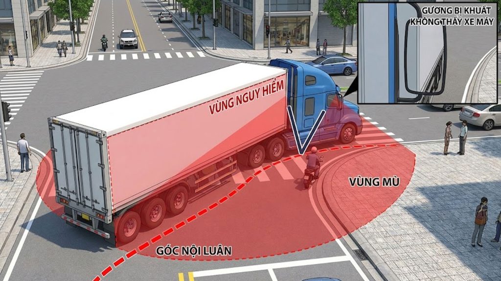 Lái xe đầu kéo kéo theo sơ mi rơ moóc dài 12 mét đến 15 mét là một thử thách cực lớn, đặc biệt là khi phải vào cua tại các ngã tư đông đúc. Một trong những nguyên nhân hàng đầu gây ra các vụ tai nạn thương tâm chính là “điểm mù” và hiện tượng “cắt góc” (hay còn gọi là góc nội luân).
