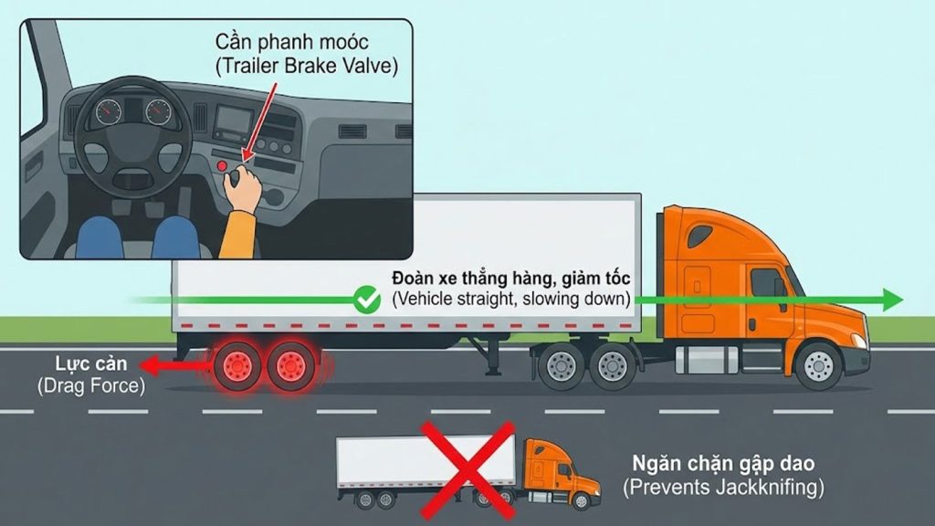 • Tác dụng: Phanh moóc sẽ tạo ra một lực cản từ phía sau, giống như một chiếc “neo” giữ cho đoàn xe luôn thẳng hàng và giảm dần tốc độ, ngăn chặn hiện tượng “gập dao” (Jackknifing – moóc đẩy đầu kéo xoay ngang).