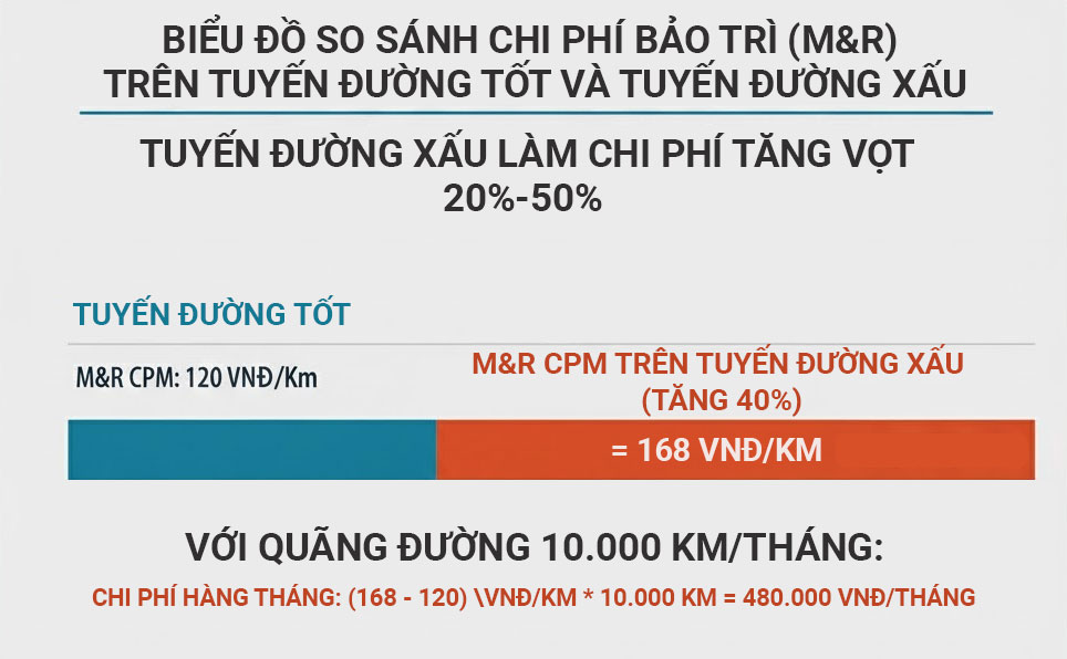 - So sánh CPM (VNĐ/Km): Báo cáo phân tích chi phí theo tài sản thường chỉ ra rằng chi phí bảo trì trên mỗi Km (M&R CPM) của rơ moóc chạy trên tuyến đường xấu có thể tăng từ 20\% đến 50\% so với rơ moóc chạy trên đường cao tốc tốt.