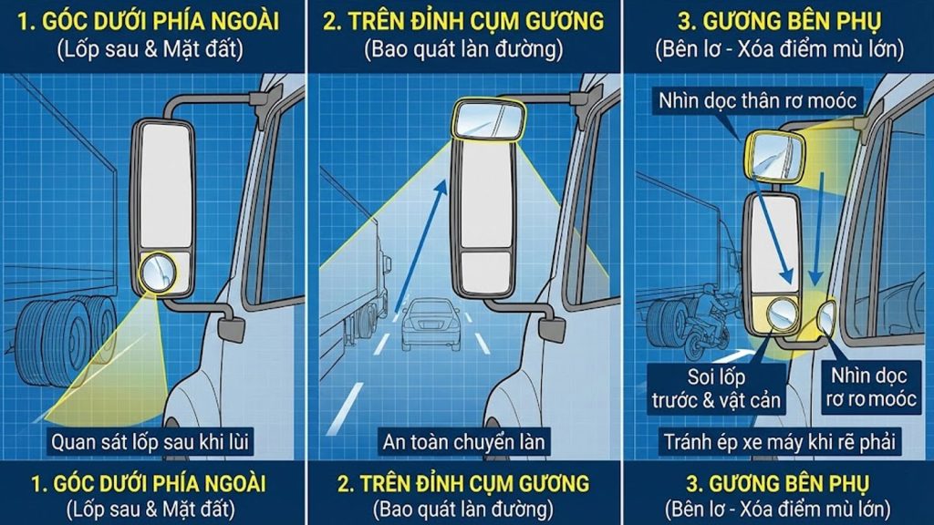 - Gương cầu lồi bên phụ (Bên lơ): Đây là bên có điểm mù lớn nhất. Ngoài gương chiếu hậu, nên lắp thêm một gương cầu tròn soi lốp trước và một gương cầu lồi nhìn dọc thân sơ mi rơ moóc để tránh ép xe máy khi rẽ phải.