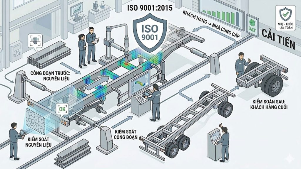 Trong ngành sản xuất cơ khí vận tải hạng nặng, chất lượng không chỉ là một khẩu hiệu tiếp thị mà là yếu tố sống còn quyết định sự an toàn của con người và tài sản trên mỗi dặm đường. Đối với Tân Thanh, việc duy trì vị thế dẫn đầu trong lĩnh vực sản xuất sơ mi rơ moóc và container tại Việt Nam suốt hơn 30 năm qua bắt nguồn từ một nền tảng vững chắc: Hệ thống quản lý chất lượng theo tiêu chuẩn quốc tế ISO 9001.