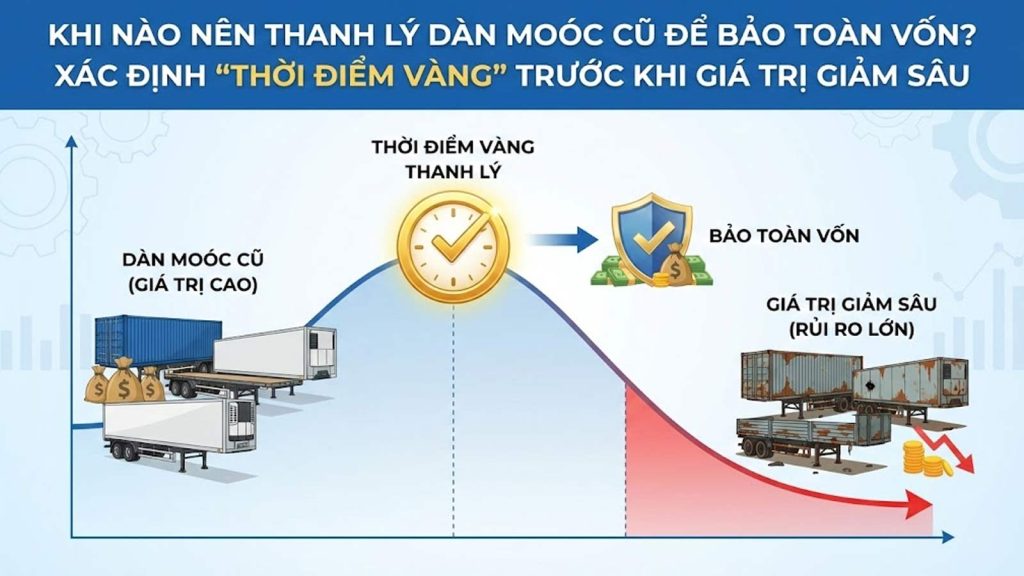 Trong quản trị doanh nghiệp vận tải, việc mua thêm sơ mi rơ moóc (SMRM) mới chỉ là một nửa của bài toán kinh doanh. Nửa còn lại, quan trọng không kém nhưng thường bị bỏ qua, chính là: Khi nào nên bán xe cũ? Nhiều chủ xe có tâm lý “tiếc của”, cố gắng tận dụng chiếc moóc đến tận cùng vòng đời cho đến khi nó trở thành sắt vụn. Tuy nhiên, những nhà vận tải chuyên nghiệp luôn biết cách xác định “thời điểm vàng” để thanh lý, nhằm thu hồi tối đa nguồn vốn và chuyển đổi sang dàn thiết bị mới hiện đại hơn.