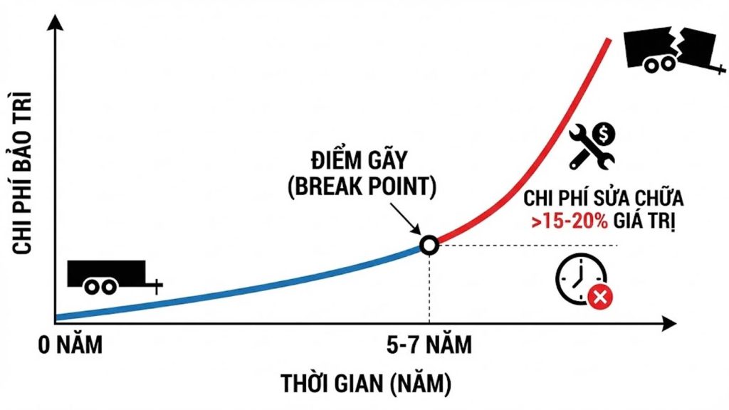 Mọi chiếc rơ moóc đều có một chu kỳ chi phí. Trong những năm đầu, chi phí bảo trì gần như bằng không. Nhưng đến một thời điểm nhất định, các linh kiện lớn bắt đầu hỏng hóc đồng loạt: hệ thống trục, giàn treo, phanh, và quan trọng nhất là sự xuống cấp của thép dầm.