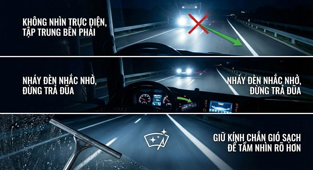 - Tuyệt đối không nhìn trực diện vào đèn pha đối diện: Khi thấy xe ngược chiều bật đèn pha quá chói, hãy hướng mắt nhìn về phía mép đường bên phải (vạch kẻ đường hoặc hộ lan). Việc này giúp bạn vẫn quan sát được quỹ đạo di chuyển của mình mà không bị “mù tạm thời” do ánh sáng mạnh.