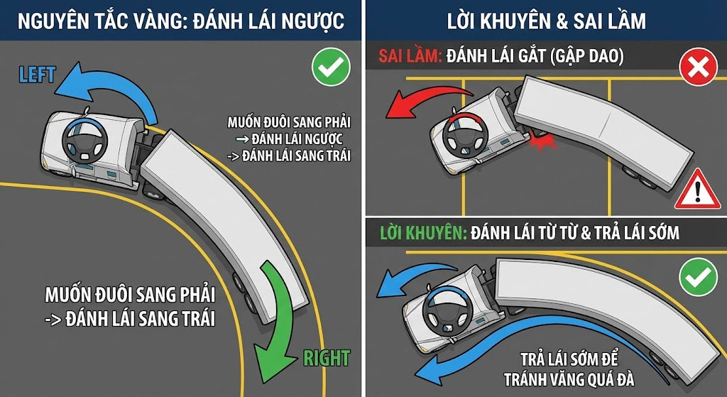 - Lời khuyên: Hãy đánh lái từ từ. Một sai lầm phổ biến là đánh lái quá gắt (hết lái) khiến xe bị “gập dao” (jackknife). Khi xe đã bắt đầu vào quỹ đạo mong muốn, hãy trả lái sớm để thân mooc không bị văng quá đà.