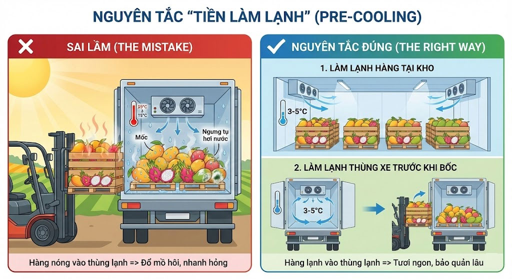 Sai lầm lớn nhất của nhiều tài xế là dùng máy lạnh của rơ mooc để làm lạnh trái cây đang nóng. Máy lạnh trên mooc được thiết kế để duy trì nhiệt độ, không phải để hạ nhiệt độ khối hàng khổng lồ.