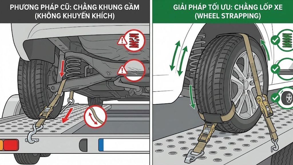 Giải pháp tối ưu: Chằng trực tiếp vào lốp xe (Wheel Strapping). Phương pháp này giúp xe ô tô vẫn có thể nhún tự nhiên trên hệ thống treo của chính nó, trong khi bánh xe được khóa chặt hoàn toàn vào sàn sơ mi rơ moóc.