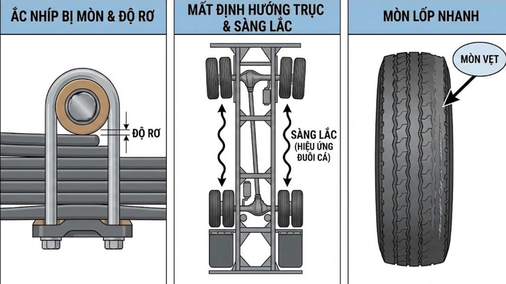 - Mất định hướng trục: Các trục bánh xe không còn được giữ vuông góc tuyệt đối với dầm chính. Một độ rơ chỉ vài milimet tại ắc nhíp có thể khiến bánh xe bị lệch góc vài độ trên mặt đường.