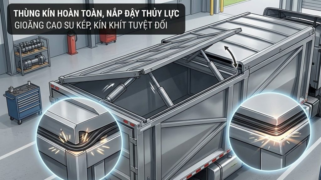 1. Thiết kế thùng kín và hệ thống nắp đậy thủy lực