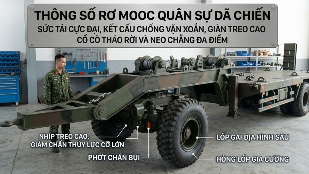 Vận chuyển thiết bị quân sự (xe bọc thép, khí tài, bệ phóng tên lửa hoặc trạm radar dã chiến) đòi hỏi những tiêu chuẩn kỹ thuật hoàn toàn khác biệt so với vận tải thương mại thông thường. Trong môi trường tác chiến hoặc diễn tập, rơ mooc phải hoạt động trên những địa hình không có đường xá, từ bùn lầy sâu đến đồi núi dốc đứng.