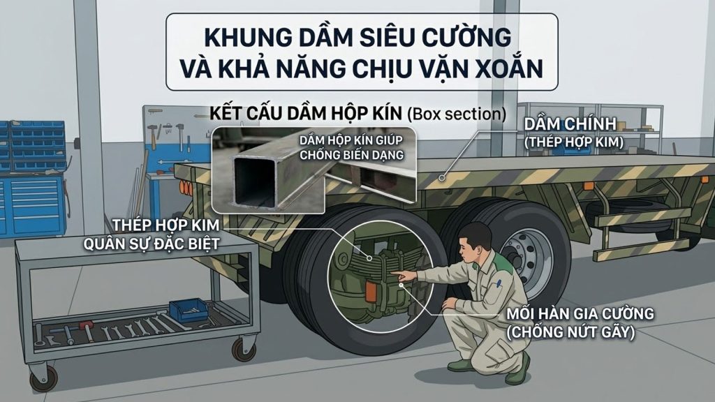 - Kết cấu dầm hộp kín (Box section): Thay vì dầm I thông thường, các dòng mooc quân sự thường được thiết kế dầm hộp kín hoặc gia cường các thanh giằng chéo dày đặc để chống lại hiện tượng biến dạng khung khi chở các khối thiết bị có trọng tâm không ổn định.