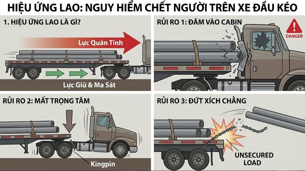 - Mất trọng tâm: Khi hàng bị xô về phía trước, trọng tâm dồn đột ngột lên mâm xoay (Kingpin), khiến xe mất lái hoặc gãy cổ moóc.