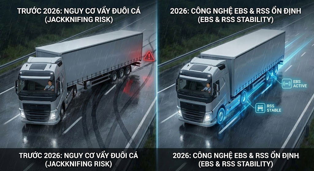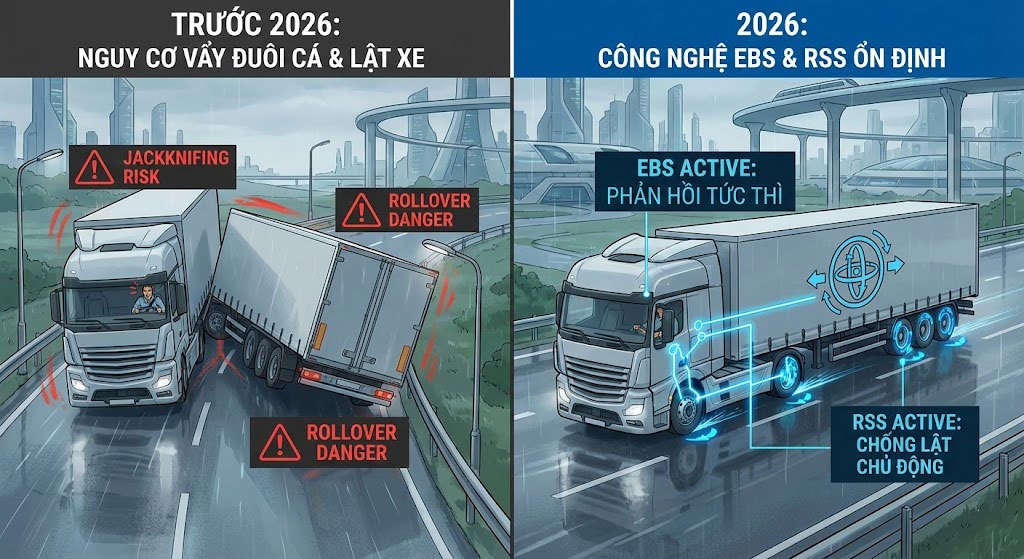 Nếu như trước đây, nỗi sợ lớn nhất của tài xế xe mooc là hiện tượng vẩy đuôi cá (jackknifing) khi phanh gấp, thì công nghệ phanh hiện đại năm 2026 đã giải quyết triệt để vấn đề này.