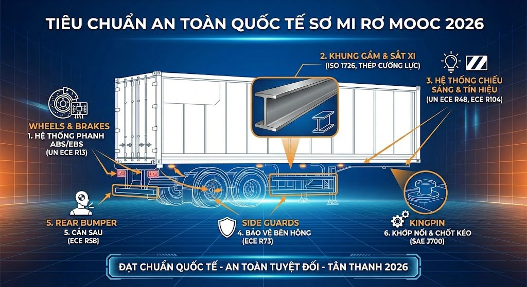 Trong kỷ nguyên vận tải toàn cầu hóa năm 2026, chiếc sơ mi rơ mooc không còn đơn thuần là một khung thép bánh xe. Để đáp ứng việc vận chuyển hàng hóa xuyên biên giới và chạy trên các tuyến cao tốc hiện đại, rơ mooc phải tuân thủ nghiêm ngặt các tiêu chuẩn an toàn quốc tế.