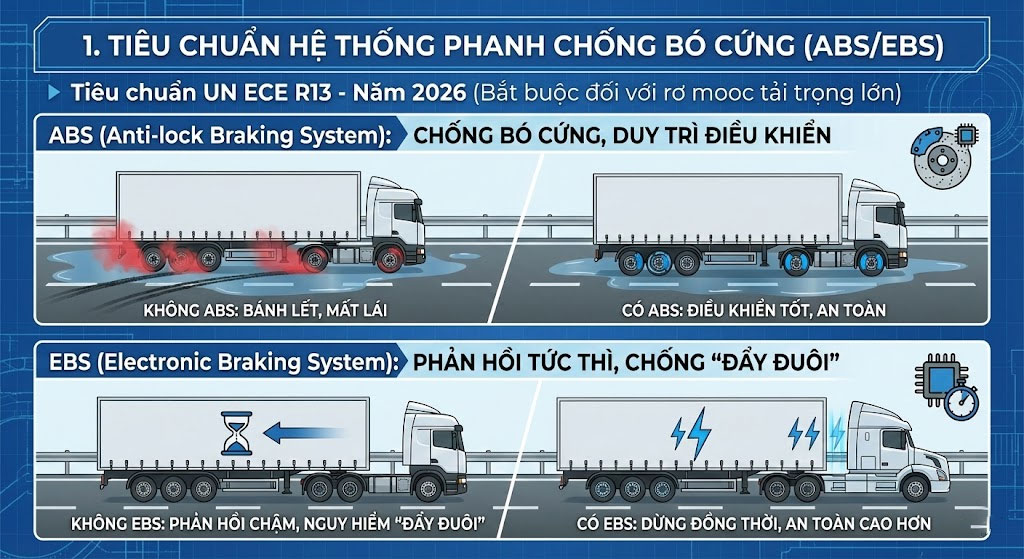 Năm 2026, hệ thống phanh ABS (Anti-lock Braking System) gần như đã trở thành quy định bắt buộc đối với rơ mooc tải trọng lớn tại Việt Nam và quốc tế.