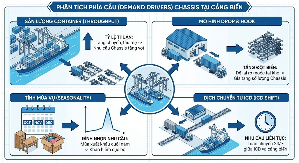- Tính mùa vụ của hàng hóa: Các tháng cuối năm (mùa xuất khẩu đồ gỗ, may mặc) và mùa nông sản tạo ra các đỉnh nhọn về nhu cầu, thường gây ra tình trạng khan hiếm Chassis cục bộ tại các cảng trung chuyển.