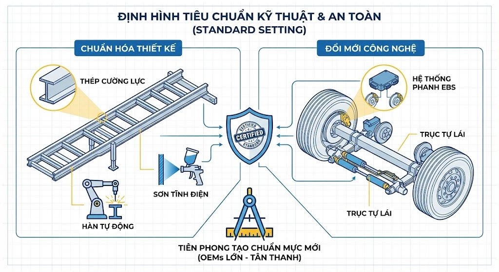 - Đổi mới công nghệ: Khi một OEM lớn như Tân Thanh tích hợp hệ thống phanh EBS hoặc trục tự lái vào dòng sản phẩm phổ thông, họ vô hình trung tạo ra một “chuẩn mực mới” về an toàn cho toàn thị trường, thúc đẩy các cơ quan đăng kiểm cập nhật quy định phù hợp với thực tế.