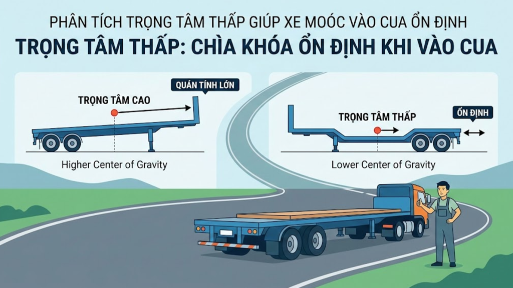 - Giảm độ nghiêng thân xe: Khi vào cua, một chiếc moóc có trọng tâm thấp sẽ ít bị “vặn” và nghiêng hơn so với moóc cao. Điều này giữ cho áp lực lốp được phân bổ đều xuống mặt đường, tăng độ bám cho tất cả các bánh xe.