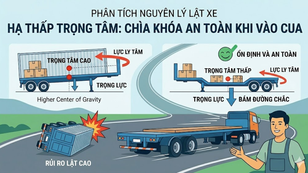 Một trong những giải pháp kỹ thuật then chốt mà Tân Thanh Container áp dụng để nâng cao chỉ số an toàn giao thông chính là thiết kế hạ thấp trọng tâm thông qua việc tối ưu hóa chiều cao sàn moóc. Bài viết này sẽ phân tích chuyên sâu tại sao trọng tâm thấp lại là yếu tố sống còn giúp xe moóc vào cua ổn định và ngăn ngừa thảm họa lật xe khi vận hành ở tốc độ cao.