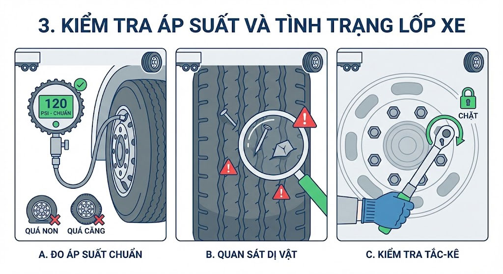 3. Kiểm tra áp suất và tình trạng lốp xe