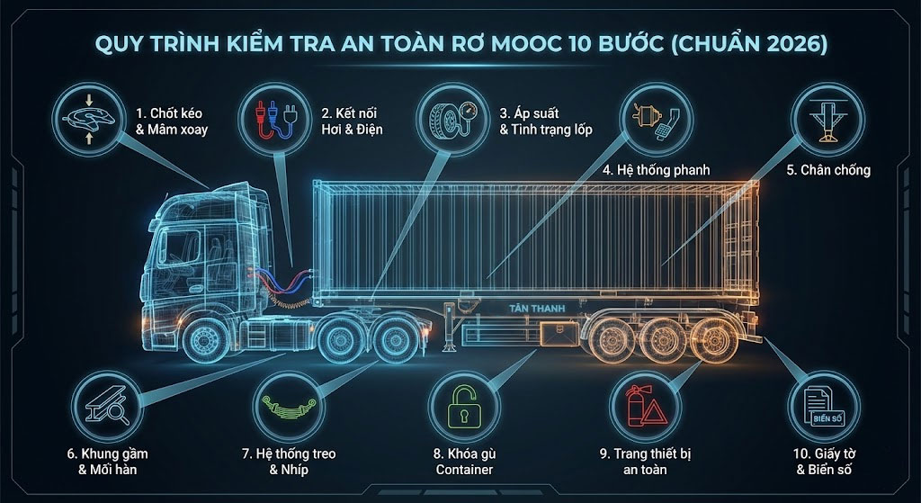 Để đảm bảo mỗi chuyến hàng là một hành trình bình an, mọi bác tài cần nằm lòng quy trình kiểm tra rơ mooc 10 bước dưới đây trước khi lăn bánh.
