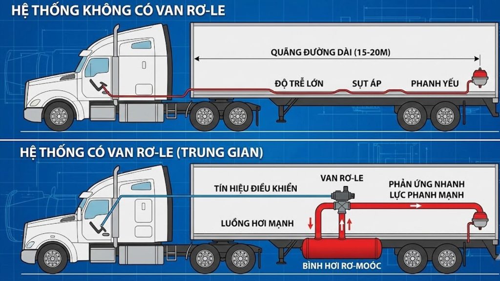 Van rơ-le (Relay Valve) giải quyết vấn đề này bằng cách đóng vai trò như một công tắc trung gian. Nó sử dụng một luồng hơi tín hiệu nhỏ từ cabin để điều khiển một luồng hơi nén cực mạnh có sẵn trong bình hơi của sơ mi rơ moóc tống thẳng vào các bầu phanh.