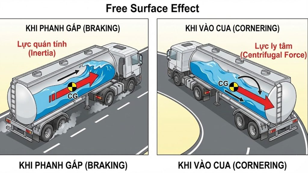• Khi vào cua: Chất lỏng dồn sang một bên, làm trọng tâm (CG) của xe thay đổi đột ngột. Nếu lực ly tâm kết hợp với sự dịch chuyển này vượt qua giới hạn thăng bằng, xe sẽ bị lật ngay lập tức dù tốc độ chưa phải là quá nhanh.