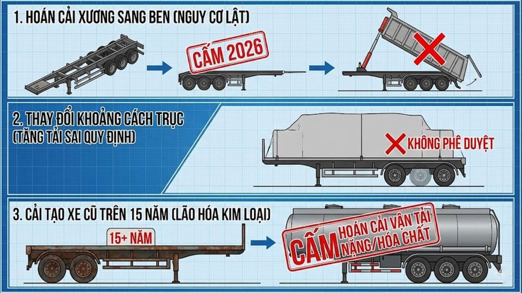 - Thay đổi khoảng cách trục để tăng tải trọng: Các hành vi dịch chuyển trục (axle) nhằm thay đổi phân bổ tải trọng để chở hàng quá khổ sẽ không còn được chấp nhận nếu không có sự phê duyệt từ nhà sản xuất gốc.