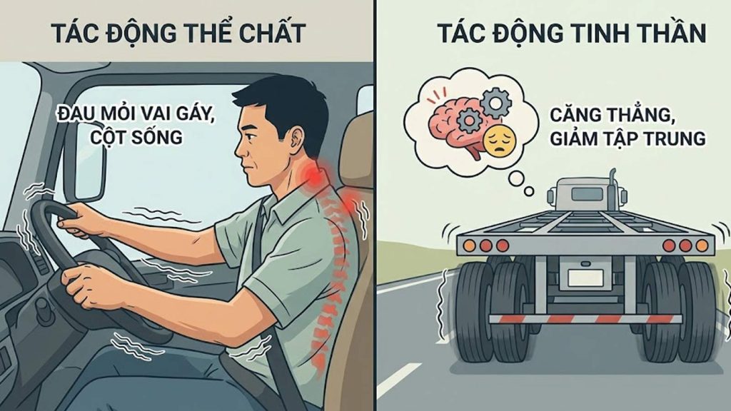 • Tác động thể chất: Những rung động li ti nhưng kéo dài này khiến cơ bắp tài xế luôn trong trạng thái gồng cứng để giữ vô lăng thẳng, dẫn đến đau mỏi vai gáy và cột sống mãn tính.