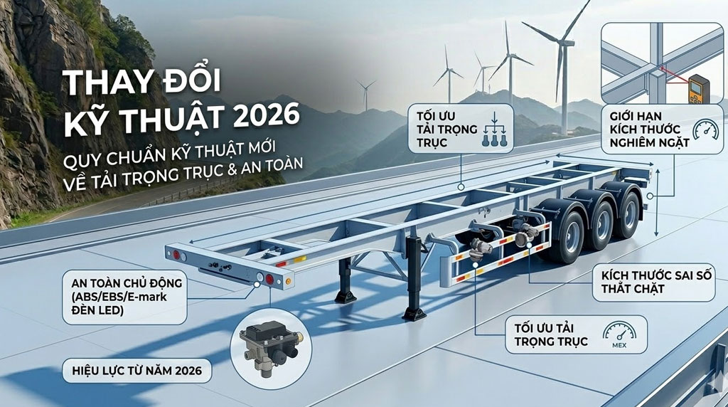 Với việc tổng trọng tải (Gross Vehicle Weight – GVW) bị kiểm soát chặt chẽ bởi camera phạt nguội và trạm cân tự động, xu hướng thiết kế mooc 2026 sẽ dịch chuyển sang sử dụng vật liệu hợp kim hoặc thép siêu cường lực để giảm tự trọng xe xuống mức thấp nhất, nhằm “nhường” phần khối lượng đó cho hàng hóa.