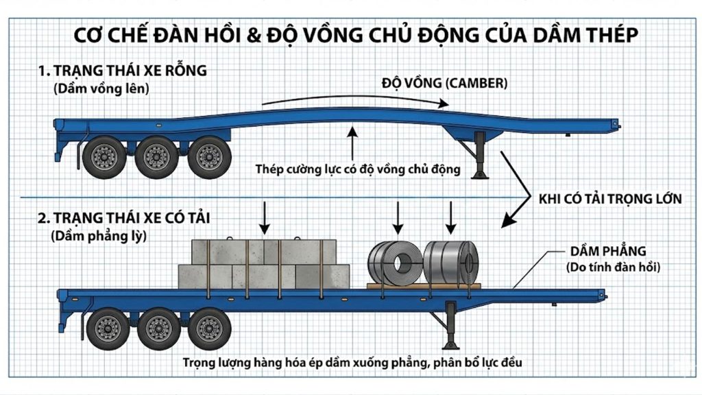 - Độ vồng chủ động: Các kỹ sư thiết kế sắt-xi có độ vồng ngược lên phía trên để khi đặt hàng chục tấn hàng lên, dầm xe sẽ bị ép xuống và trở nên phẳng lỳ.