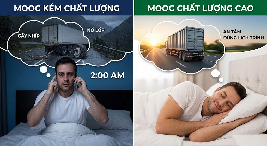 • Với mooc kém chất lượng: Những sự cố này xảy ra như “cơm bữa” do hệ thống phụ tùng trôi nổi và kết cấu thép yếu. Mỗi lần xe nằm đường là một lần chủ xe mất ngủ vì lo tìm xe cứu hộ, lo hàng trễ chuyến tàu, và lo chi phí sửa chữa cắt cổ.