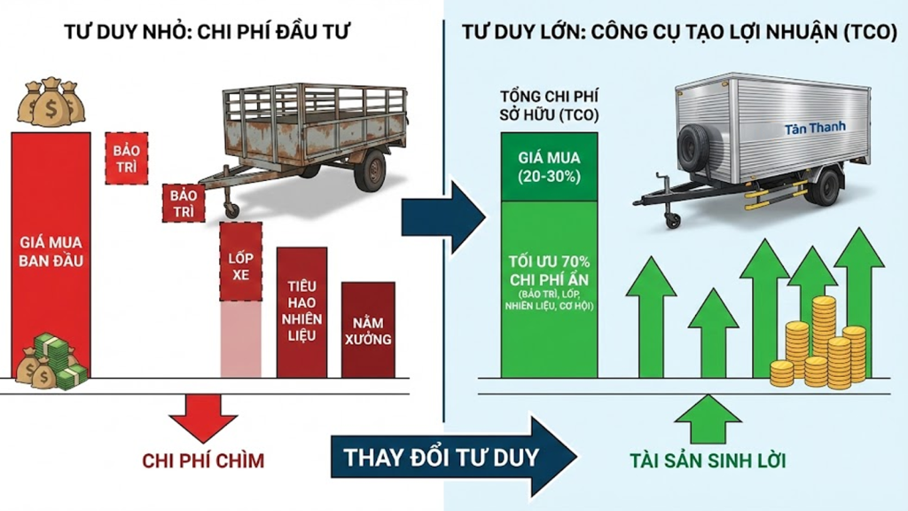 Ngược lại, các doanh nghiệp lớn áp dụng tư duy Tổng chi phí sở hữu (Total Cost of Ownership – TCO). Họ hiểu rằng giá mua chỉ chiếm khoảng 20-30% tổng số tiền họ phải chi cho chiếc moóc đó trong suốt vòng đời 15-20 năm. 70% còn lại nằm ở chi phí bảo trì, lốp xe, tiêu hao nhiên liệu của đầu kéo và đặc biệt là chi phí cơ hội khi xe phải nằm xưởng. Một chiếc rơ moóc chất lượng cao, có thương hiệu uy tín như Tân Thanh được coi là tài sản sinh lời vì nó tối ưu hóa được 70% chi phí ẩn này.