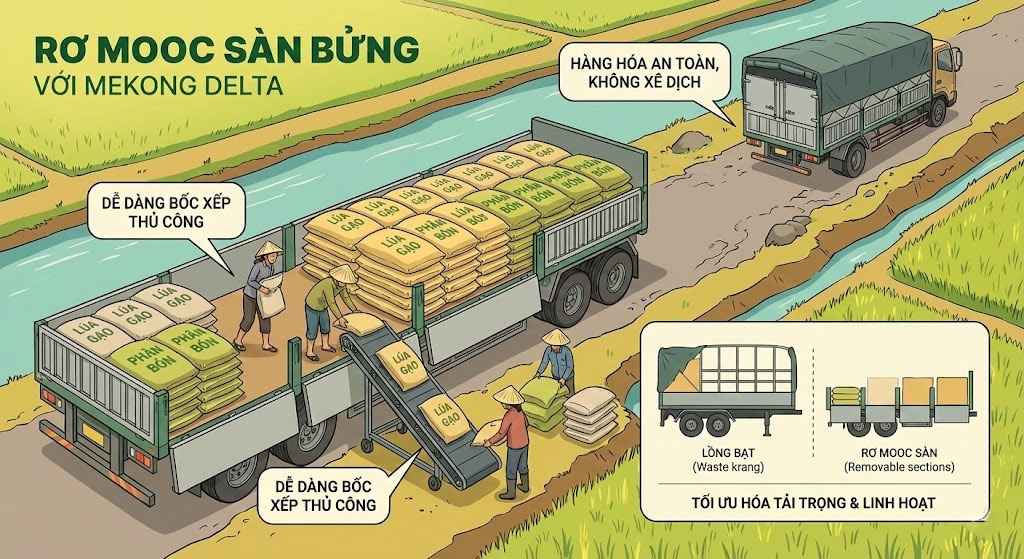 Nếu miền Đông Nam Bộ là thủ phủ của container xương sàn, thì tại các tỉnh miền Tây (Đồng bằng sông Cửu Long), dòng sơ mi rơ mooc sàn bửng (hay còn gọi là mooc bửng) lại chiếm ưu thế tuyệt đối. Từ các vựa lúa tại An Giang, Đồng Tháp đến các vùng chuyên canh cây ăn trái tại Tiền Giang, Bến Tre, chiếc mooc bửng đã trở thành hình ảnh quen thuộc trên các tuyến quốc lộ.