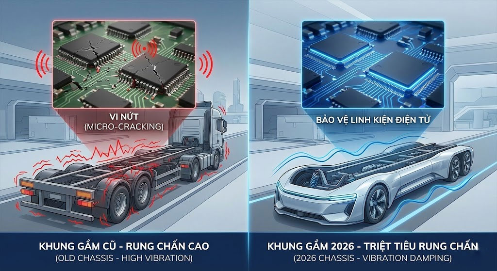 Khi rơ mooc di chuyển trên đường, nếu khung gầm (sắt xi) không có độ đàn hồi tốt hoặc hệ thống treo cứng nhắc, các rung chấn từ mặt đường sẽ truyền trực tiếp lên sàn xe và tác động vào hàng hóa. Đối với bo mạch điện tử, các rung động liên tục này gây ra hiện tượng vi nứt ở các mối hàn siêu nhỏ mà mắt thường không thấy được, khiến sản phẩm bị lỗi ngay khi xuất xưởng hoặc giảm tuổi thọ nhanh chóng.