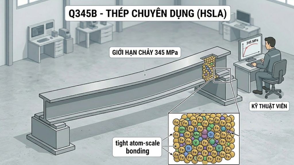 Thép Q345B là loại thép hợp kim thấp, cường độ cao (HSLA – High-Strength Low-Alloy). Trong bảng phân loại thép quốc tế, ký hiệu “Q” đại diện cho “Giới hạn chảy” (Yield Strength), và con số “345” chính là giá trị giới hạn chảy tối thiểu tính bằng đơn vị Megapascal (MPa).