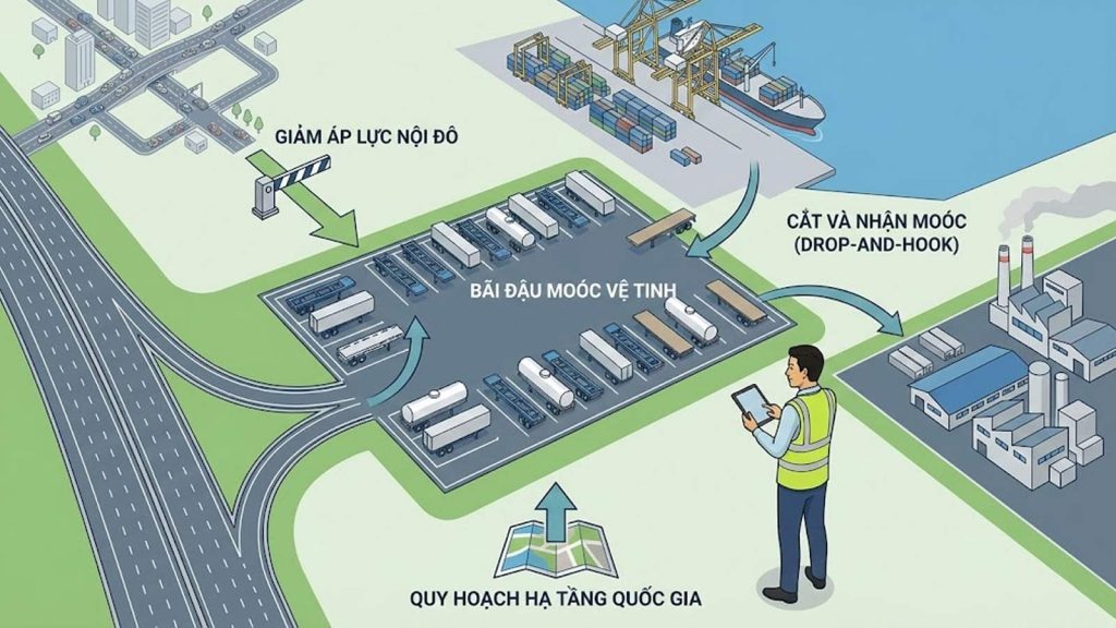 Bãi đậu moóc vệ tinh (Satellite Trailer Parking) là các trạm trung chuyển được đặt tại các vị trí tiếp giáp giữa các trục đường cao tốc, cảng biển, hoặc các khu công nghiệp. Thay vì kéo theo moóc trống đi quãng đường dài về kho bãi trung tâm, xe đầu kéo có thể thực hiện thao tác “drop-and-hook” (cắt moóc và nhận moóc mới) ngay tại các điểm vệ tinh này.