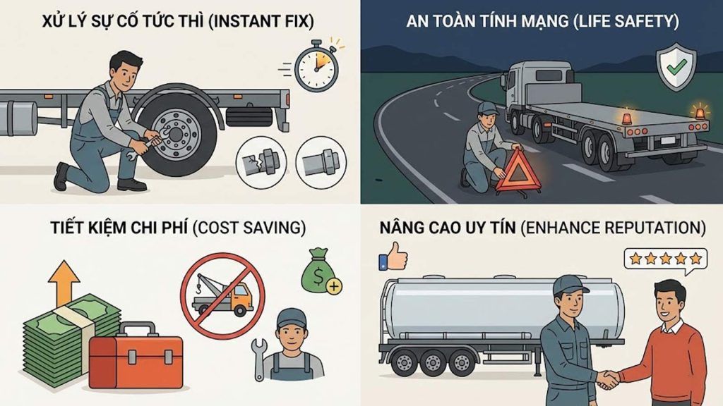 • Tiết kiệm chi phí khổng lồ: Chi phí một lần gọi xe cứu hộ hoặc thợ sửa lưu động trên cao tốc có thể gấp 10 lần giá trị của cả bộ đồ nghề. Chưa kể thiệt hại do trễ giờ giao hàng, hỏng hàng lạnh do mất nguồn điện.