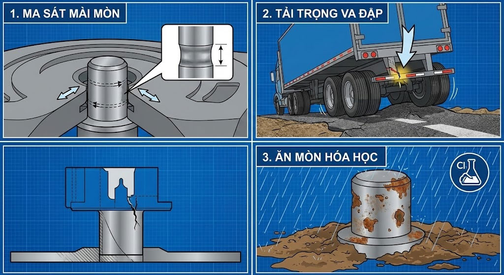 • Ma sát mài mòn: Mỗi khi xe vào cua, tăng tốc hoặc phanh gấp, sự va đập và ma sát giữa chốt kéo và mâm xoay (Fifth Wheel) sẽ làm đường kính chốt bị thu nhỏ dần theo thời gian.